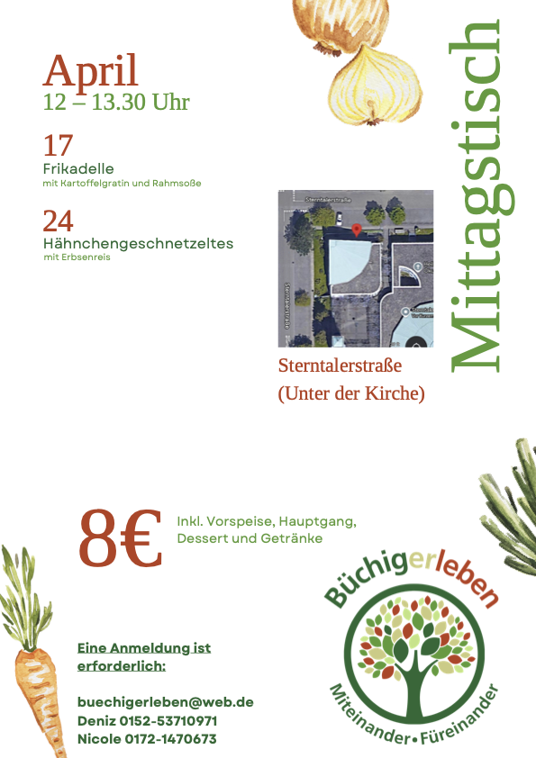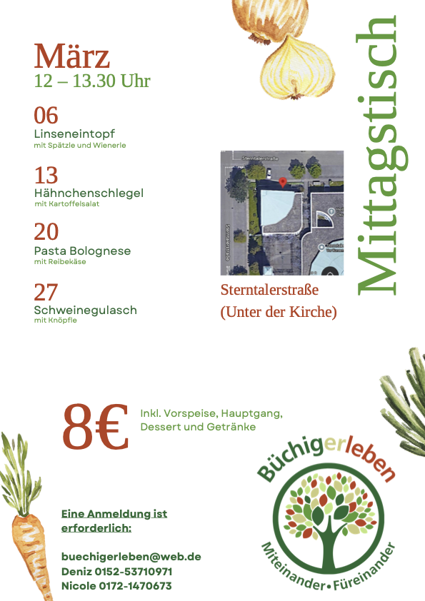Jetzt Platz sichern und gemeinsam genießen: buechigerleben@web.de oder bei Deniz: 015253710971 bzw. bei Nicole: 01721470673.